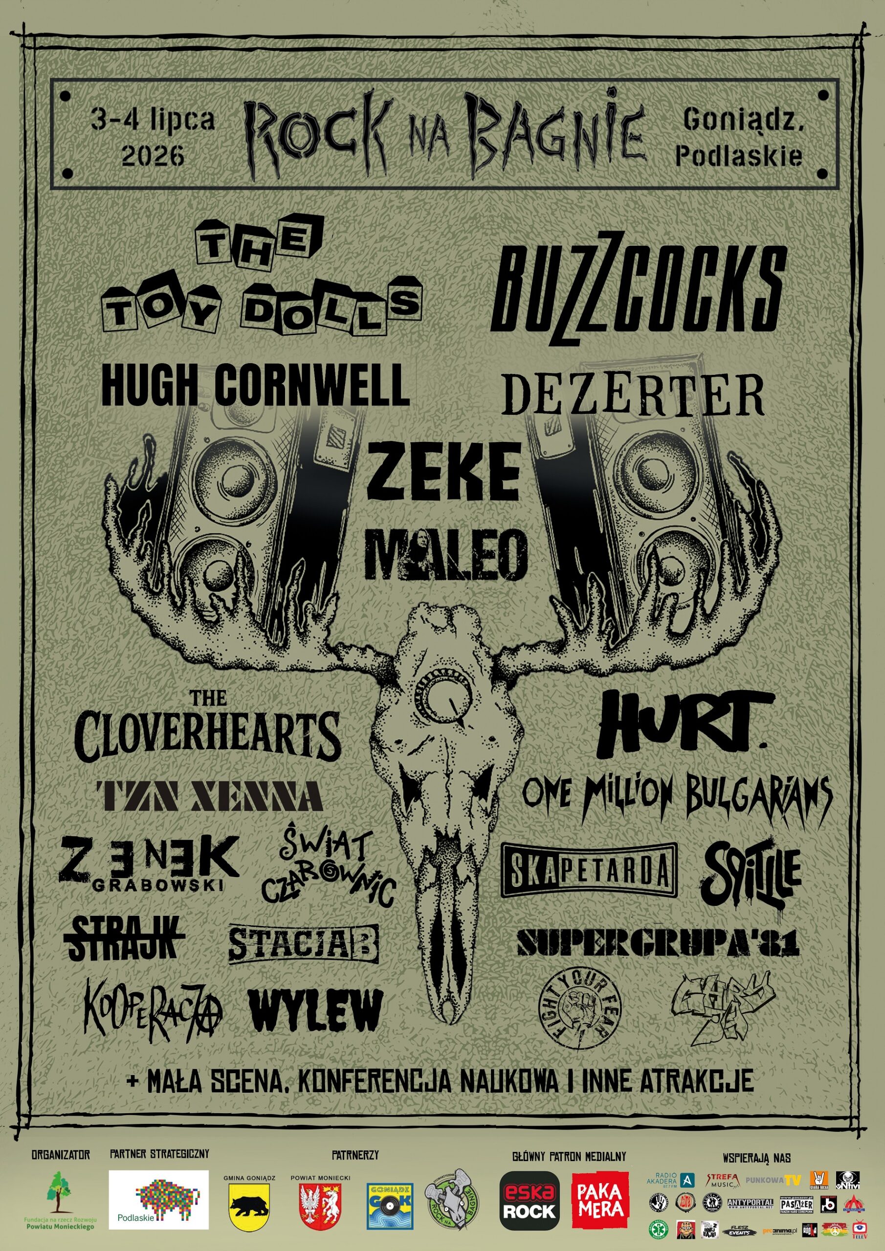 Festiwal Rock na Bagnie po raz trzeci w Goniądzu! A znacznie wcześniej, bo w lipcu 2014r., Organizatorzy Festiwalu Rock na Bagnie otrzymują podziękowania od Rady Miejskiej, Burmistrza i Przedstawicieli Mieszkańców Goniądza. Jest to jak dotychczas najbardziej cenione przez Organizatorów z otrzymanych wyróżnień potwierdzające, że Festiwal Rock na Bagnie stał się częścią przestrzeni kulturalnej uroczego Goniądza. Wspomnieć należy również, że po IV edycji Festiwalu Rock na Bagnie wielu Artystów i Uczestników nagminnie chwaliło klimaty Festiwalu oraz gościnność Mieszkańców Goniądza, porównując Rock na Bagnie do Festiwali z lat ’80 ubiegłego wieku. Jubileuszowa, V edycja Festiwalu musiała więc być jeszcze bardziej wyjątkowa. Wsparcie Mieszkańców, Władz Samorządowych udzielane Organizatorom podczas przygotowań do Festiwalu, przełożyło się w roku 2015 na otwarcie przestrzeni Miasta dla festiwalowiczów – pod patronatem Burmistrza Goniądza został zorganizowany przez Mieszkańców jarmark, będący pierwszą z okołofestiwalowych imprez promującą wśród Uczestników Festiwalu podlaskich artystów ludowych, naturalną żywność, napoje, wyroby rękodzielnicze. Skwer obok Goniądzkiego Domu Kultury stał się miejscem spotkań festiwalowiczów z Mieszkańcami i bezpośredniego zetknięcia z regionalnymi wyrobami. Było to świetne uzupełnienie bogatej oferty turystycznej dostępnej podczas Festiwalu. Jak co roku można było zwiedzić Twierdzę Osowiec, wędrować z przewodnikami po Biebrzańskim Parku Narodowym czy zażywać wypoczynku agroturystycznego. Ponadto w tym roku, z inicjatywy Władz Samorządowych, zostały zaoferowane dodatkowe ułatwienia turystyczno-pobytowe dla pozostających, lub ponownie odwiedzających Goniądz, festiwalowiczów. Ale wcześniej, bo na początku roku 2015 powstaje oficjalne radio Festiwalu Rock na Bagnie – Radio Bagno. Z założenia miało jedynie promować nadchodzącą, jubileuszową, V edycję Festiwalu i występujące Zespoły, jednak z uwagi na ciepłe przyjęcie przez środowisko, już po kilku tygodniach nadawało non stop. Do posłuchania były koncerty różnych kapel ze wszystkich edycji Festiwalu; kapele z nadchodzącego Rock na Bagnie 2015 ułożone w kolejności w jakiej zagrają; składanka utworów nagranych podczas bagiennych koncertów; utwory studyjne różnych kapel; audycje poświęcone konkretnej kapeli. Radio Bagno nadaje nadal. Kilka miesięcy później, na początku czerwca, ruszyła mobilna strona Festiwalu Rock na Bagnie – http://rnb.festiwal.mobi/ mająca być wsparciem dla Uczestników Festiwalu. W podróży, jak i już na miejscu, w Goniądzu, w mobilnych urządzeniach można było znaleźć program Festiwalu, atrakcje, mapę i inne przydatne informacje o samym Festiwalu i okolicy. Całość złożył Piotr Znaniecki, który będzie koordynował ten projekt w następnych latach. Parę dni później, w dniu 14 czerwca 2015r., Rock na Bagnie wraz z Przedstawicielami innych Festiwali: Ostróda Reggae, Woodstock, Malta, Slot Art i FMR Jarocin, uczestniczy w III Jarocińskim Kongresie Kultury zorganizowanym przez Stowarzyszenie Jarocin XXI i Spichlerz Polskiego Rocka w Jarocinie. Zgodnie z zapowiedziami, na Rock na Bagnie były kręcone zdjęcia do pełnometrażowej produkcji o polskiej scenie punk rockowej, „Punk From Poland”, którego scenarzystą i reżyserem jest Paweł Gumola z zespołu Moskwa. Premiera została wstępnie zaplanowana na początek 2016 roku. Jak co roku powiększyła się liczba Uczestników Festiwalu, dla których zagrały w kolejności kapele: THE TREPP, BOMBAT BELUS, UKRYTA STRONA MIASTA, STREET CHAOS, DIZEL, [peru], ROYAL SPIRIT, THE SANDALS, ZPUTNIK, THE STUBS, NOVEMBER, KABANOS, KSU, 1125, CELA NR 3. A drugiego dnia: LOLLIPOP, CZACHOYEB, TORA TORA TORA, WOUNDED KNEE, STREET TERROR, CYMEON X, INHALATORS, ZWŁOKI & przyjaciele Plexi ex DEADLOCK, Mikes SZMATA, Robert Brylewski i Paweł „Kelner” Rozwadowski, KRYZYS, PLEBANIA, ALIANS, THE ANALOGS, ARGY BARGY, BULBULATORS. Kolejny też raz Radio BUNT przez cały czas trwania Festiwalu, z otwartego dla wszystkich studia, realizowało swoją misję działając zarówno na terenie festiwalowym jak i Miasta. Transmisje na żywo koncertów, wydarzeń festiwalowych, wywiady i relacje z życia Miasta pozwalały słuchaczom wejść w atmosferę Festiwalu. Wyjątkową pod wieloma względami stała się na długo przed otwarciem w dniu 03.07.2015r. wystawa fotografii Andrzeja Talewicza przedstawiająca postać pierwszego wokalisty zespołu DEZERTER, Dariusza „Skandala” Hajna, p.t. „SKANDAL NIEZNANY”. Po raz pierwszy pokazywane publicznie zdjęcia, zgodnie z zamysłem Autora i Organizatorów Festiwalu, w szczególny, bardzo osobisty sposób, prowadziły odwiedzających wystawę przez pozasceniczne wyprawy Darka „Skandala” Hajna, którego pięćdziesiąte urodziny minęły w ubiegłym roku. Na szczególne podkreślenie zasługuje fakt, że materiały do powiększeń ufundowali: Robert Matera, Maciej Juchniewicz, Grzegorz Pękul, Krzysztof Błaszczyk, Michał Rudziecki oraz Fundacja na Rzecz Powiatu Monieckiego a wszystkie zdjęcia bezpłatnie powiększył ściśle współpracujący z Andrzejem Talewiczem właściciel studia i analogowej ciemni fotograficznej „35milimetrów” Damian Śliwiński. Druga premiera tej wystawy odbędzie się po wakacjach w Spichlerzu Polskiego Rocka w Jarocinie. Później zdigitalizowana wystawa zostanie udostępniona na ArchiwumAnarchi.pl podobnie, jak stało się to z wystawą z poprzedniej edycji Festiwalu. Kolejnym wydarzeniem, można rzec: społecznym, była premiera tomiku poezji Kordiana Michalskiego „Wpół Snu”, którego wydanie stało się możliwe dzięki sfinansowaniu przez społeczność portalu MegaTotal.pl. Coraz ważniejszy